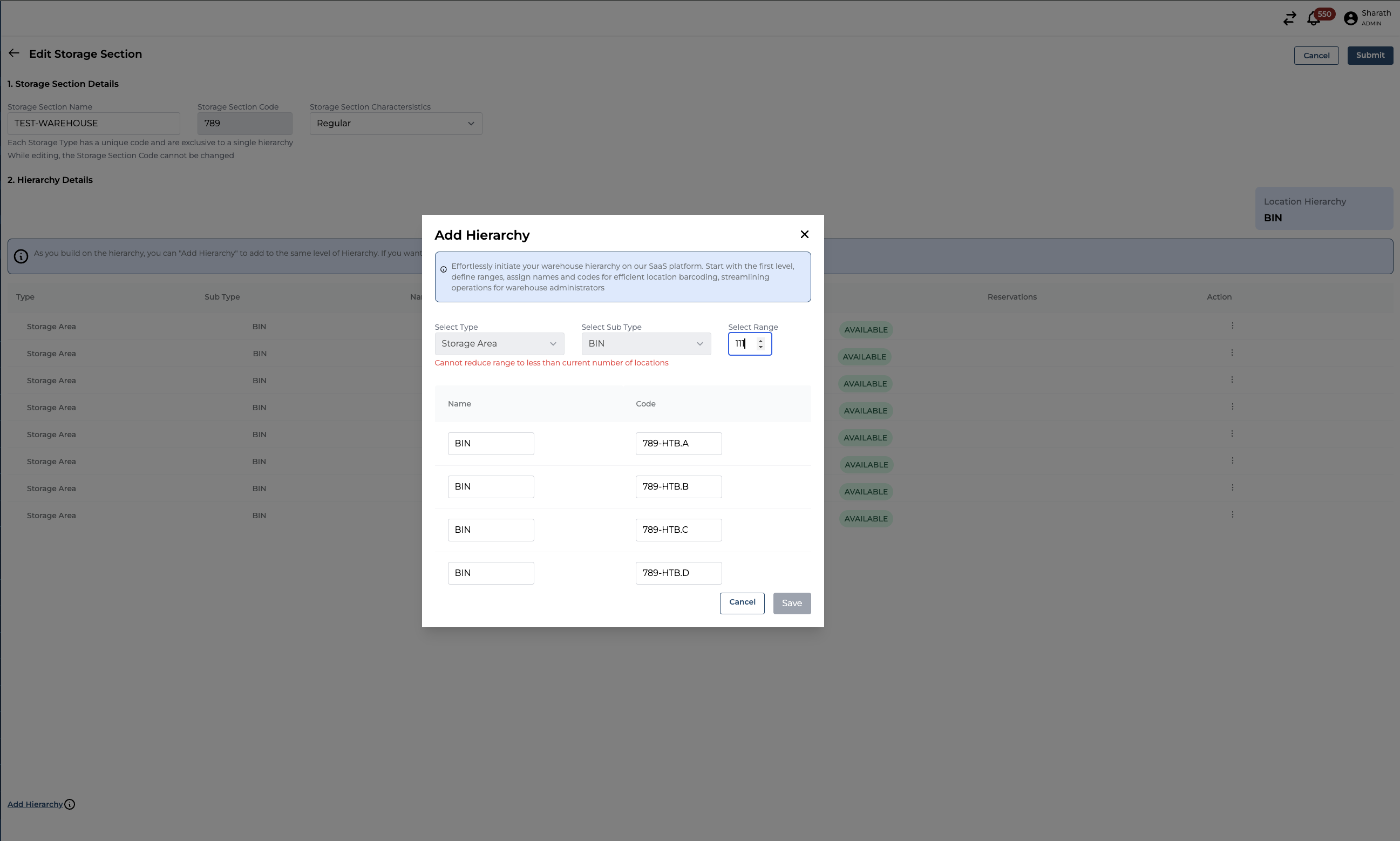 If you are trying to decrease the number of locations that are already created, you will get an error response stating, “Cannot reduce range to less than current number of locations.”