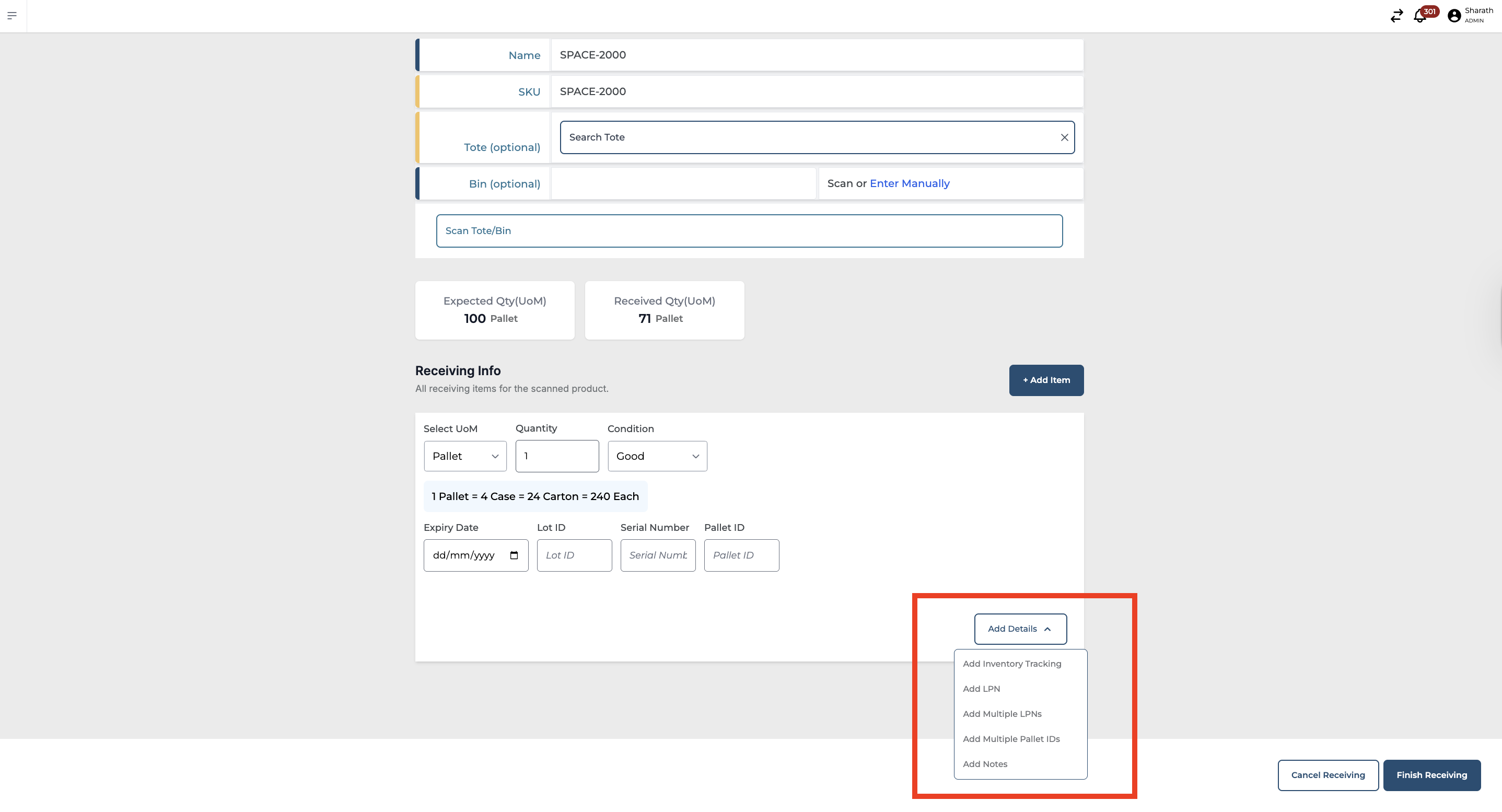 Desktop: Access the platform via your web browser, navigate to the product's receiving screen, and click on the "Add Details" option. Upon selecting this, you’ll see multiple options, including: Inventory Tracking, Add LPN, Add Multiple LPNs, Add Multiple Pallet IDs, and Notes."