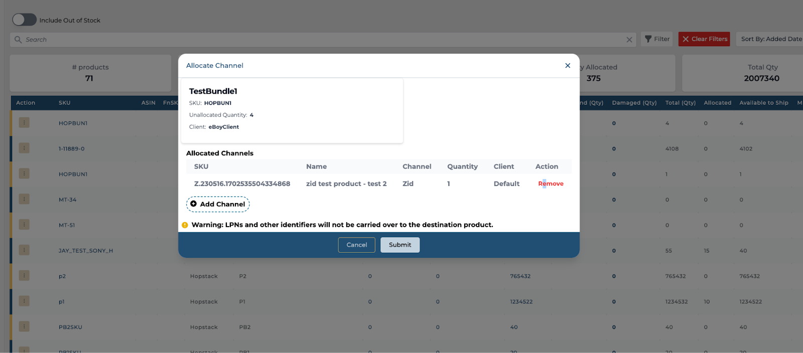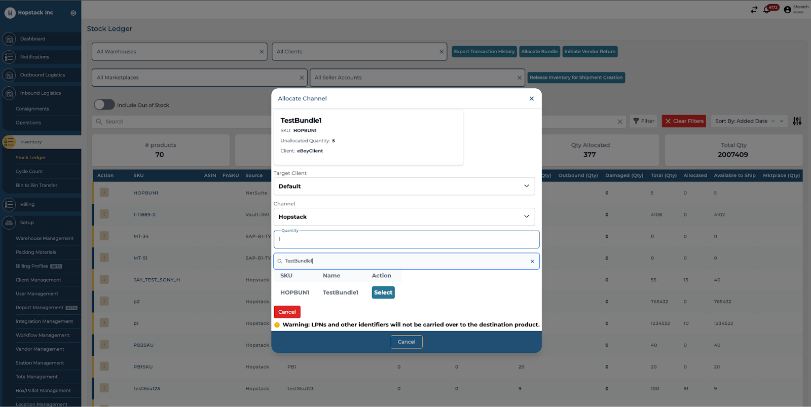 Navigate to the Allocate Channel Feature: Access this function in the platform to begin the process of transferring inventory. Select source client, channel, and SKU.