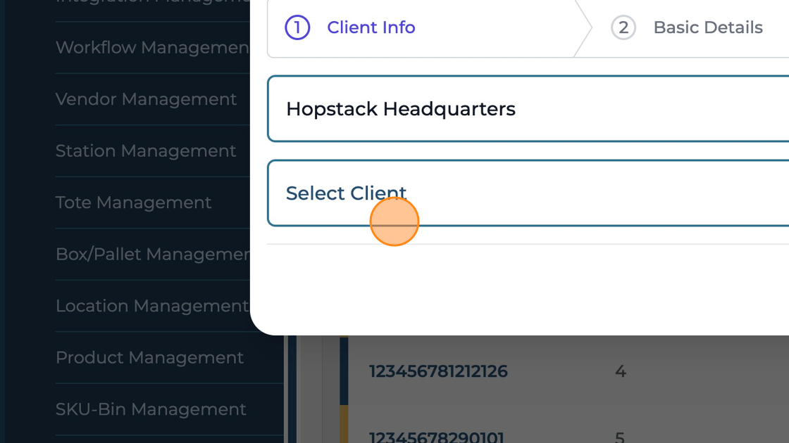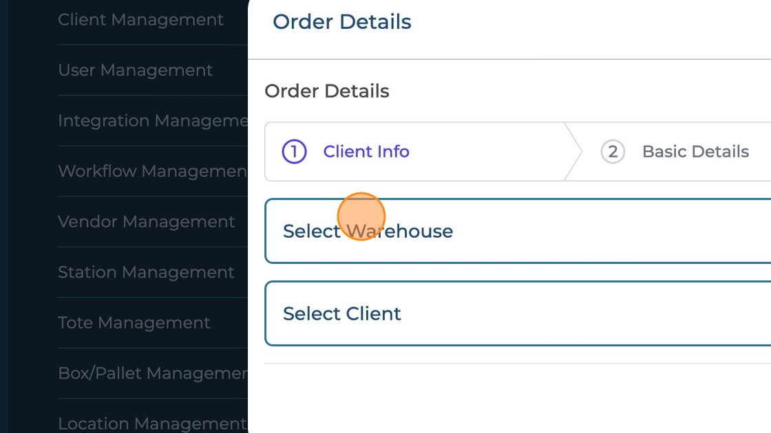 Under the "Client Info" section click on the "Select Warehouse" menu to select the desired warehouse.