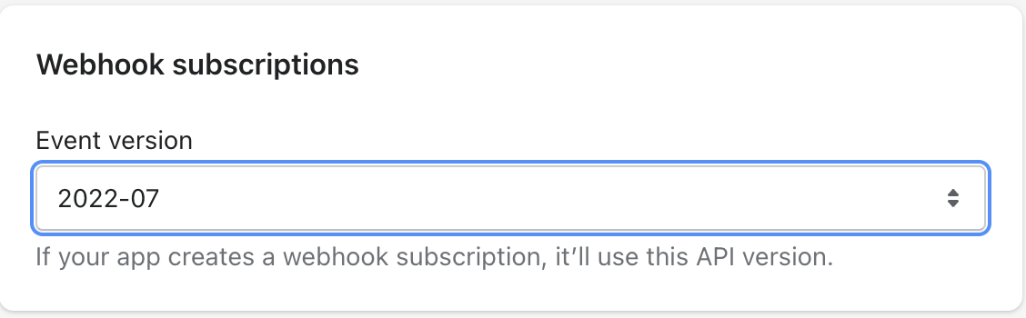 7. Under “Webhook Subscriptions”, set the following value under “Event Version” 2022-07