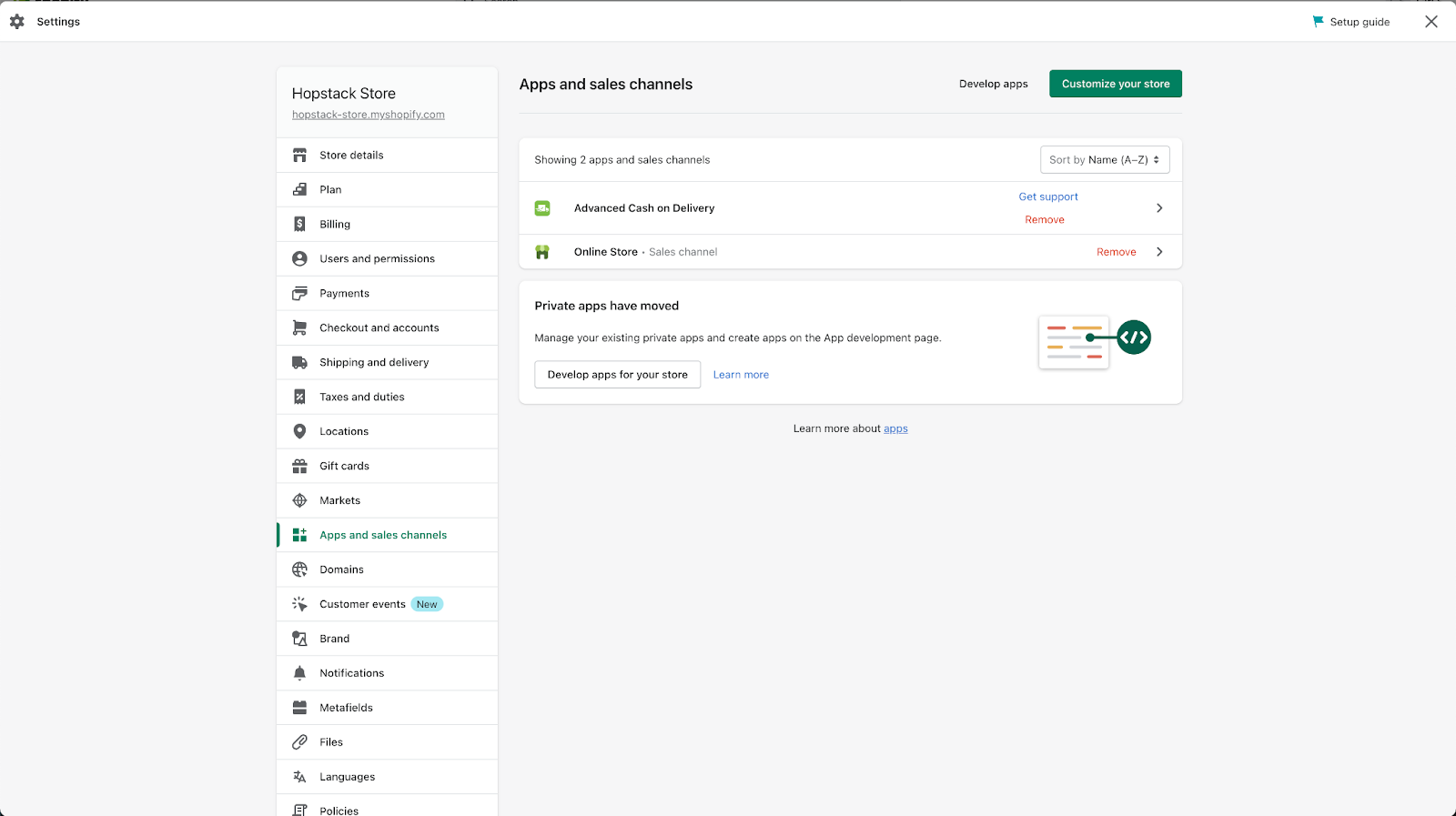 3. Click on “App and sales channel settings” from the “Apps” menu. You should see the following screen.