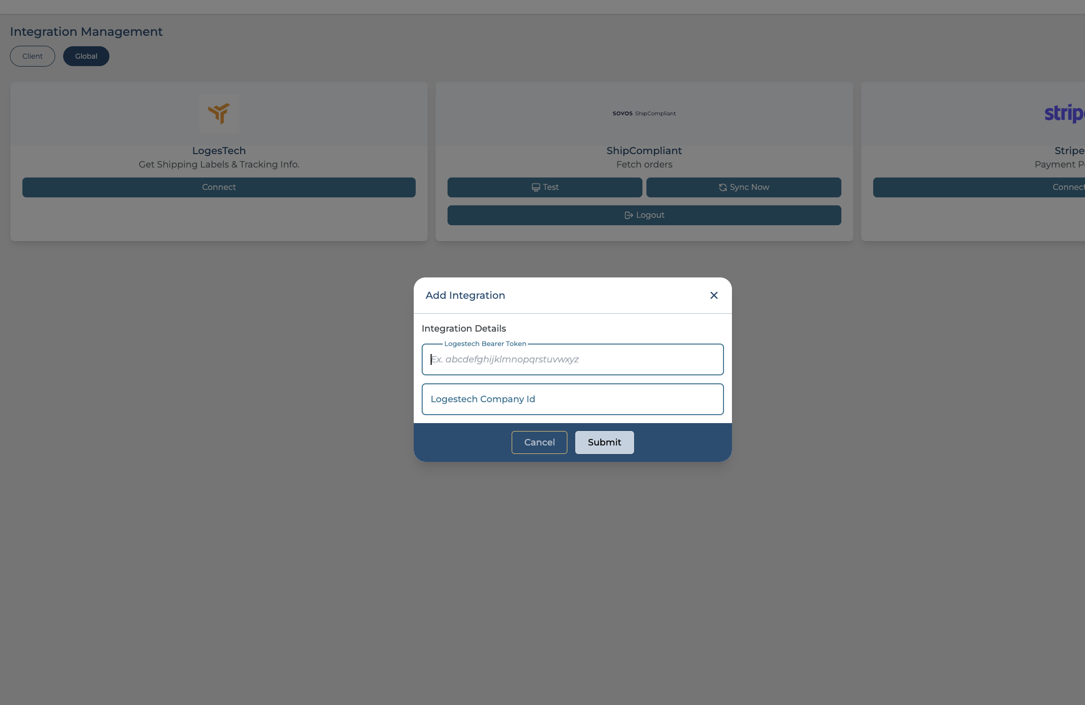To proceed with Logestech Integration must be added via the Global tab under the Integration Management screen. Two fields are mandated: