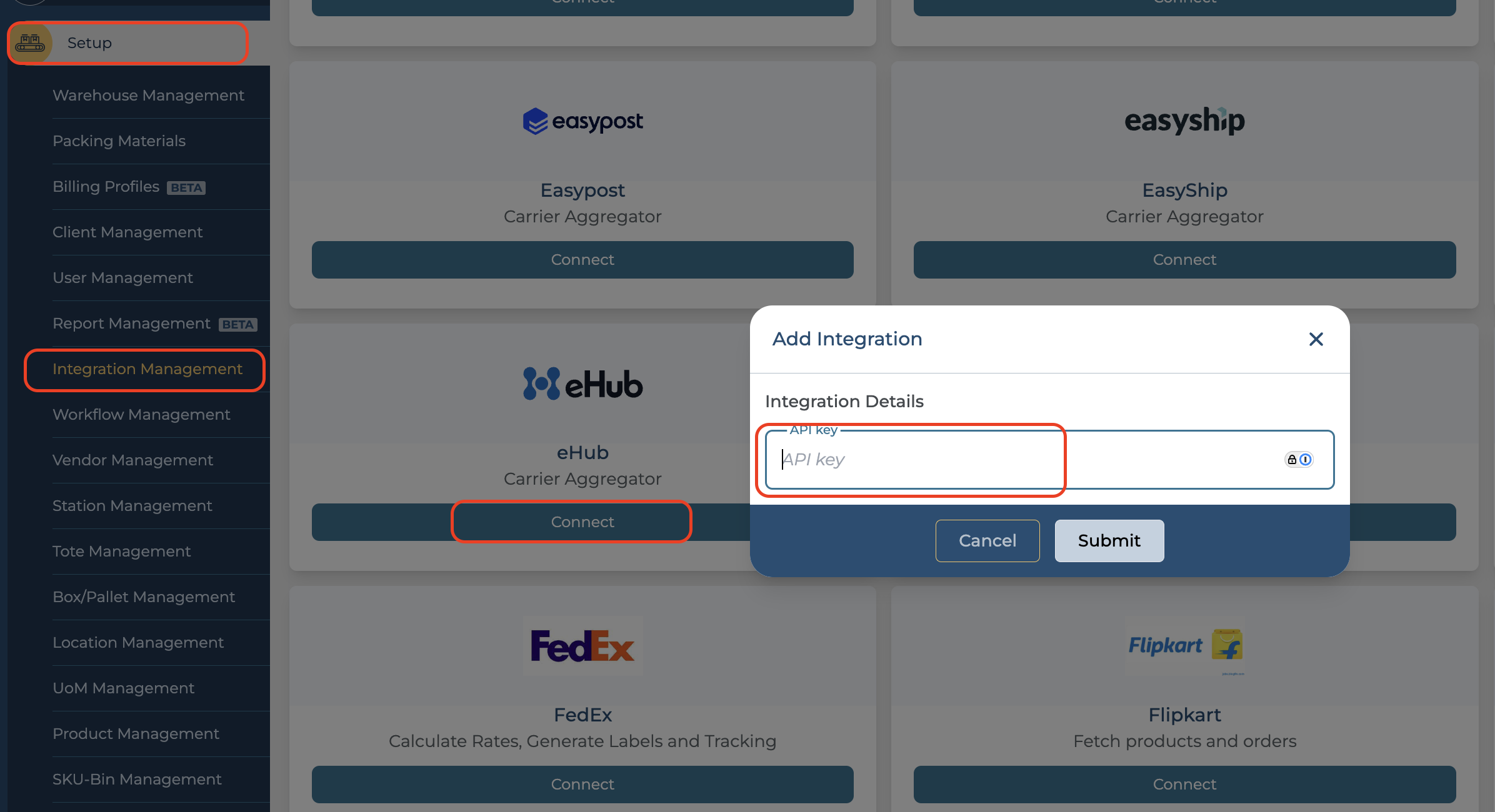 Scroll down to find the EHUB section. Click on Connect and paste the API key in the designated field.