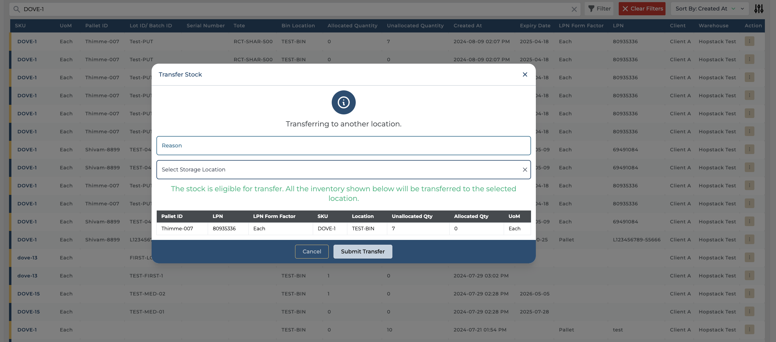 After updating the location details and reason, click on the Submit Transfer button to complete the transfer.