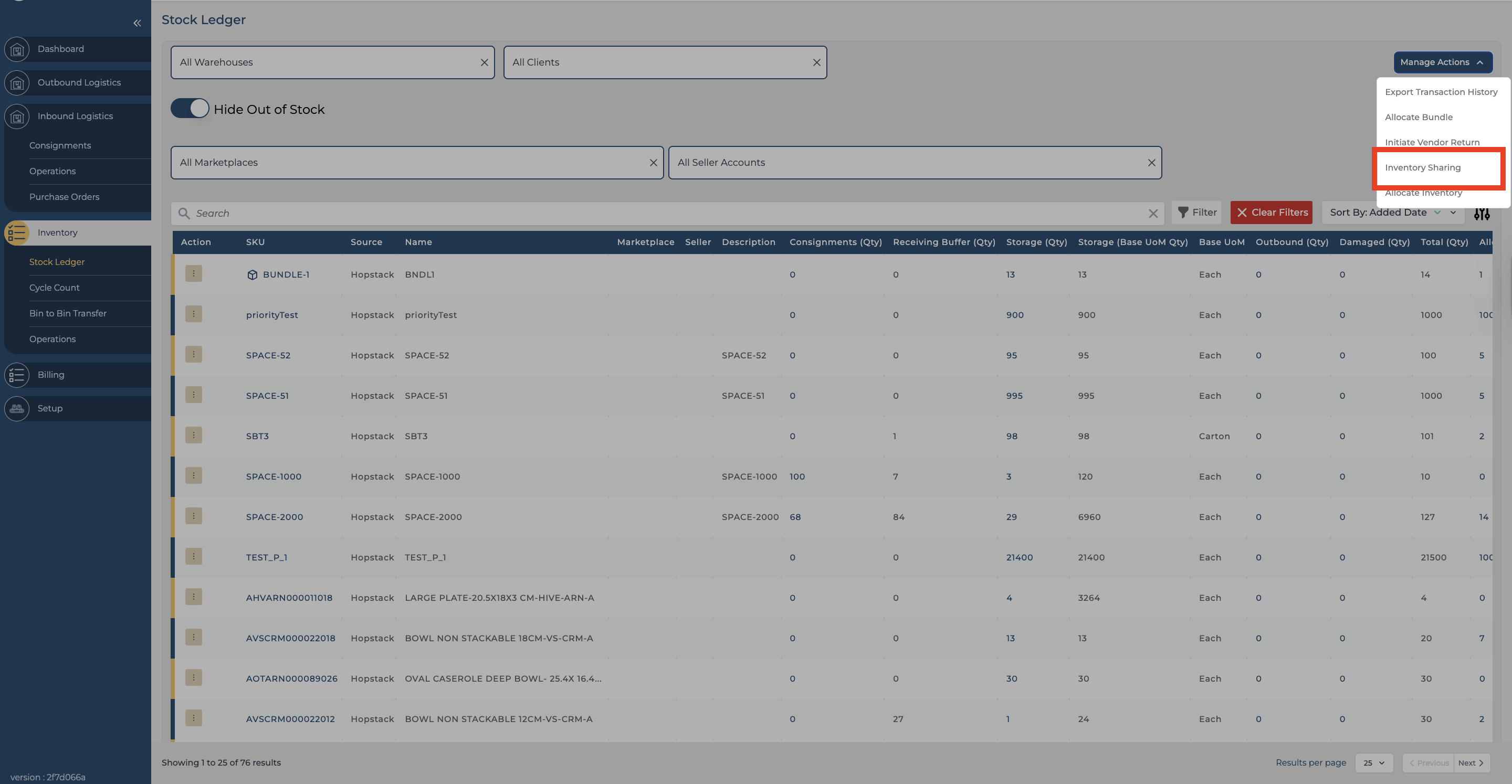 From the Manage Action dropdown, choose Inventory Sharing