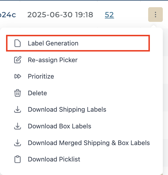 Labels can be generated either in bulk (for all batched orders at once) or individually (for a specific batched order). The process is accessible through two key areas: