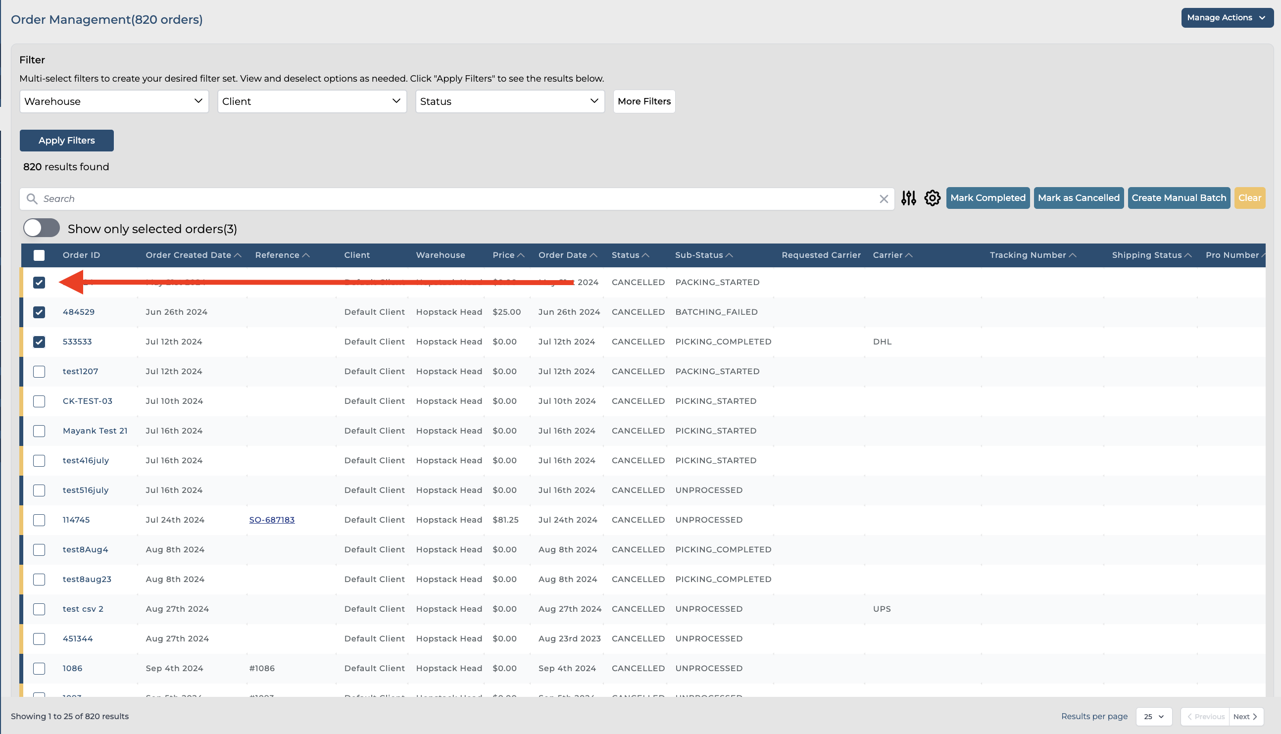 Locate the checkbox option next to the Order ID column. This checkbox allows you to select multiple orders at once for bulk actions, such as cancellations and completion.