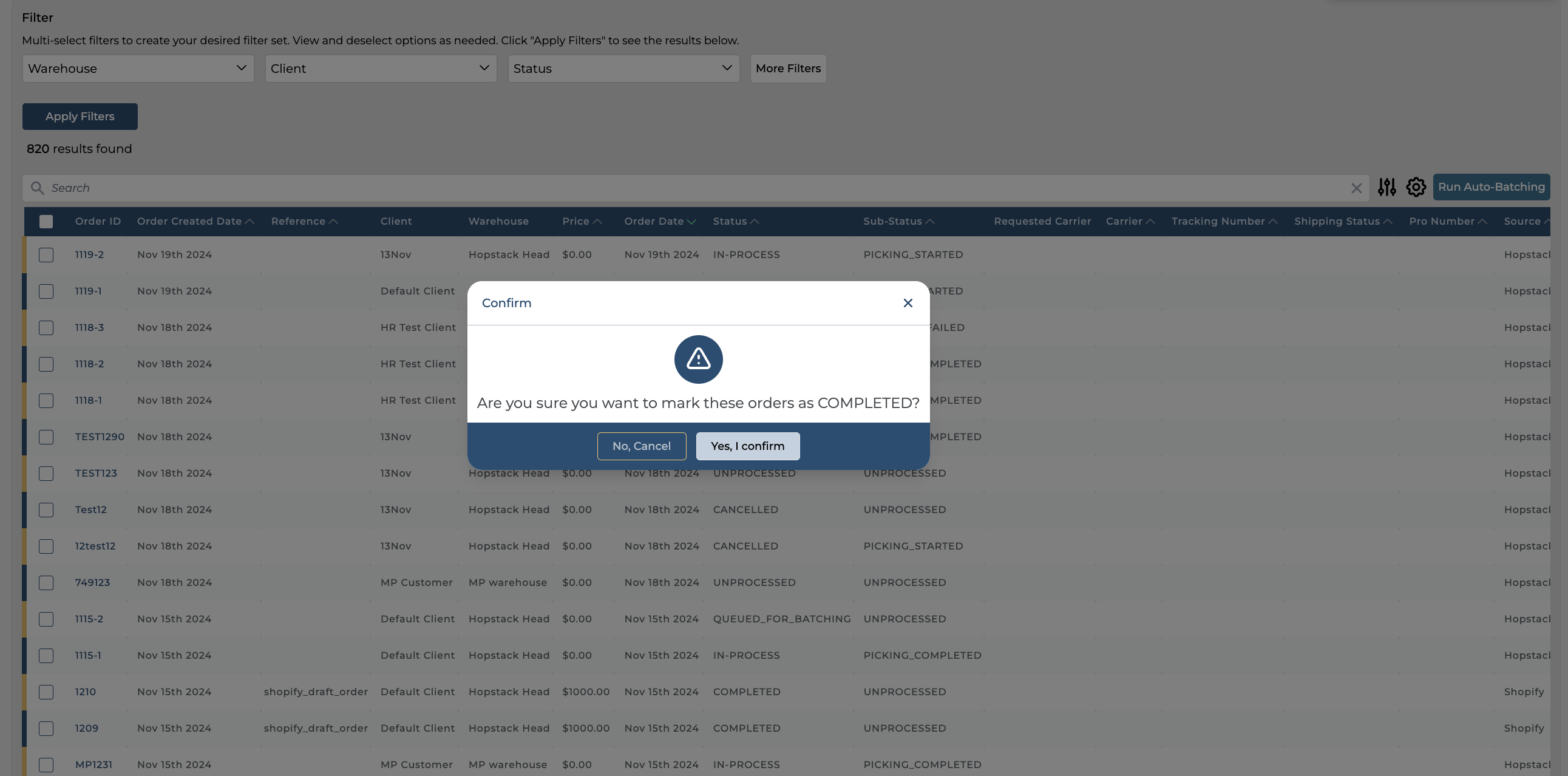 Once you click on Mark Complete or Mark as Canceled a pop-up appears on the screen asking for confirmation.