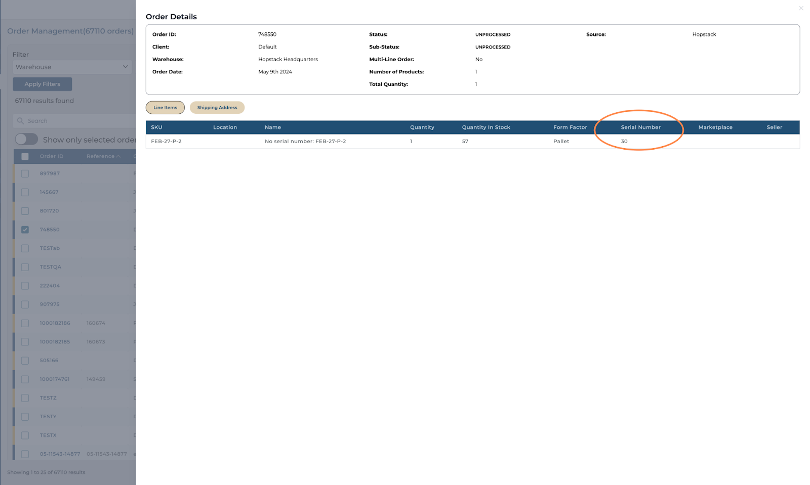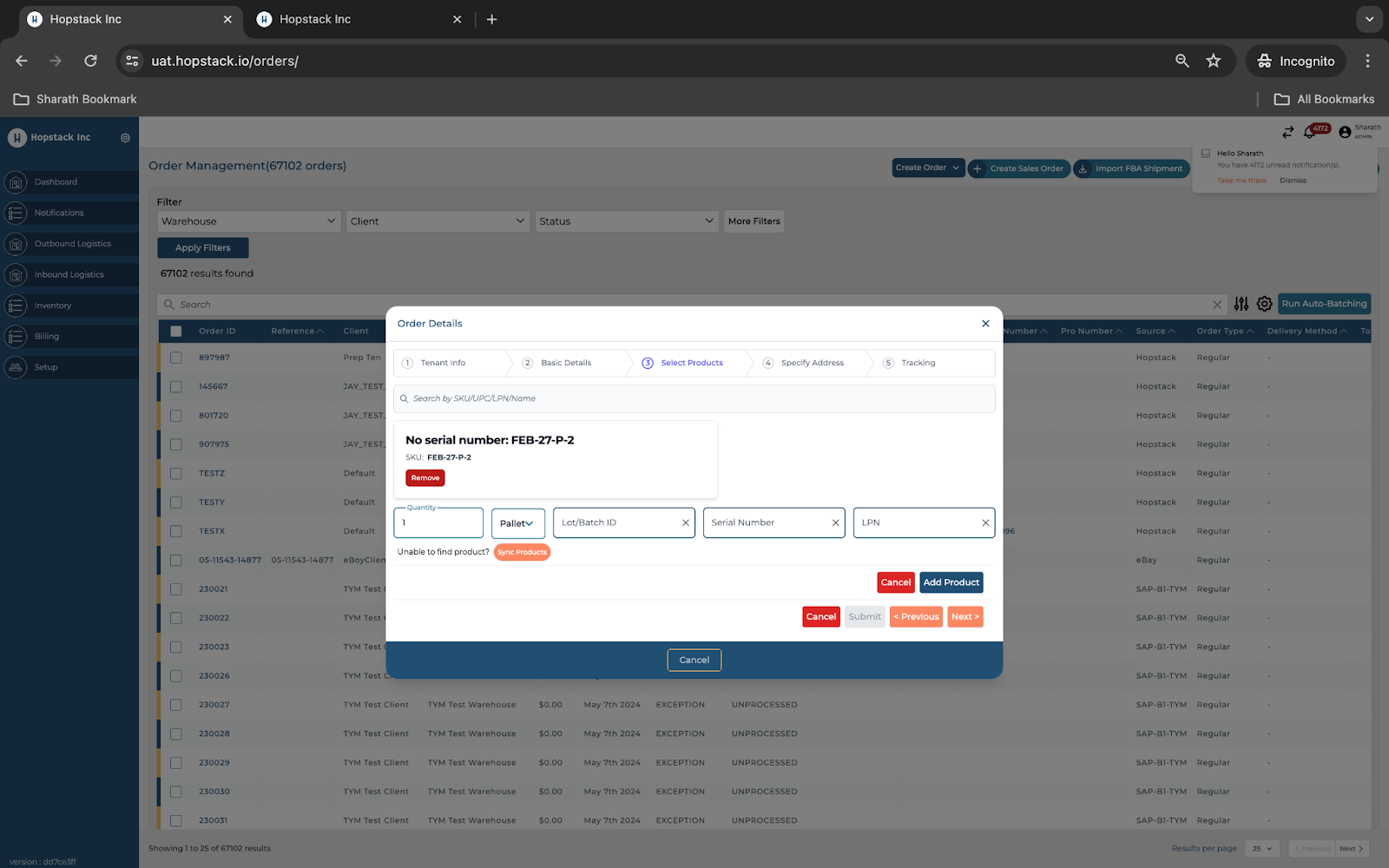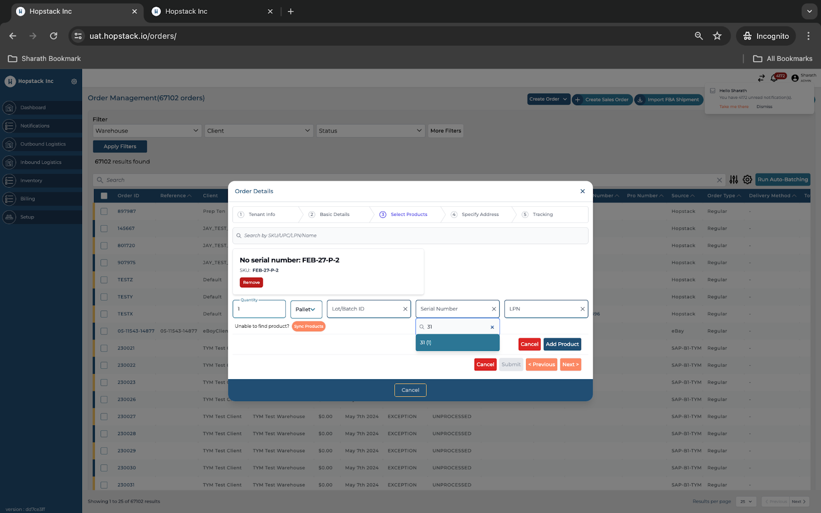 To create an order with a serial number, navigate to the Hopstack dashboard.