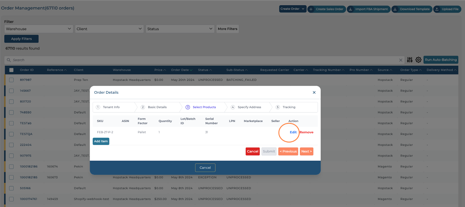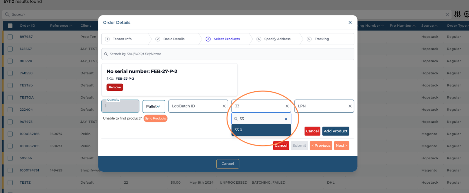 Click on the "Add Item" button to add products. During this option, you will be able to select the serial number for the SKU.Use the "Quantity" field to update the item quantity and select from the dropdown between options like each, case, carton, or pallet. serial number, Lot ID