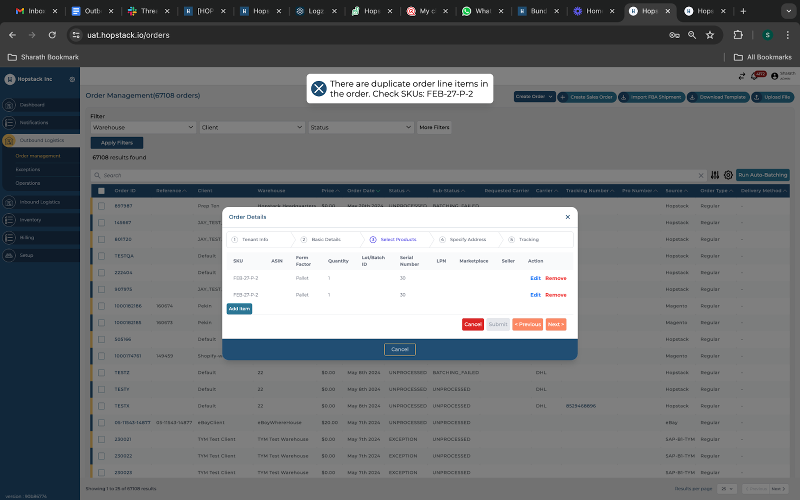 NOTE: Duplicate serial numbers are not allowed during the order creation process. The system will throw an error message “There are duplicate order line items in an order”.