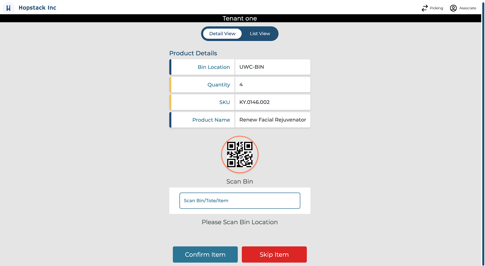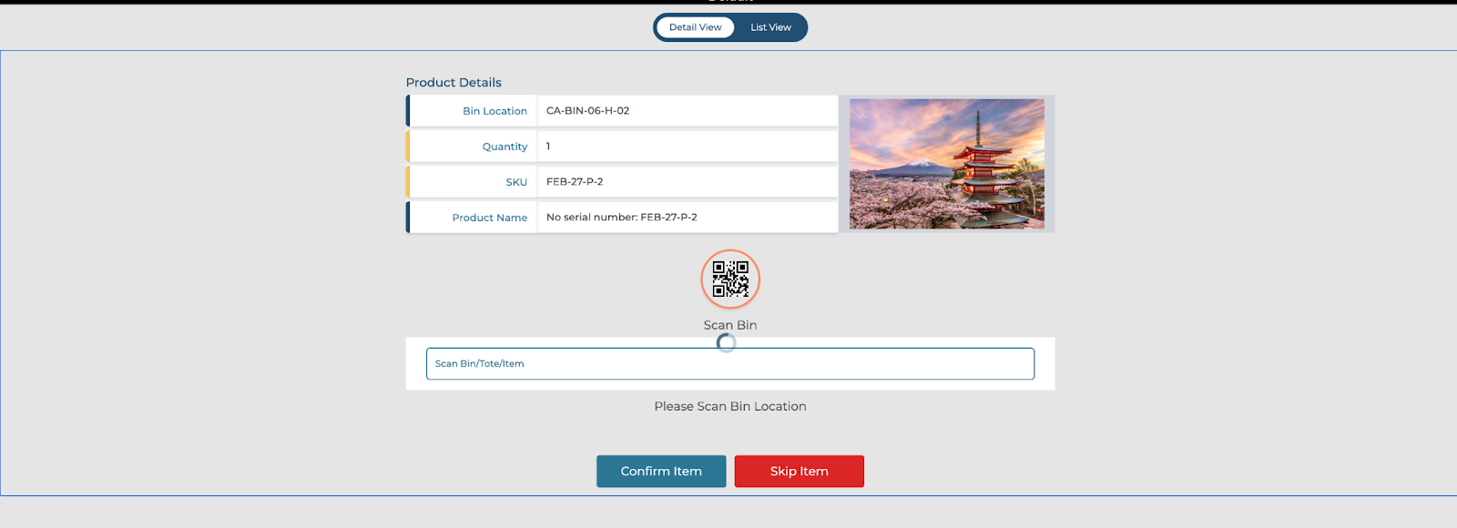 Scan the Product QR Code: After scanning the bin, a new QR code will appear matching the one on the product. Scan this QR code to confirm you have the correct product in your possession.