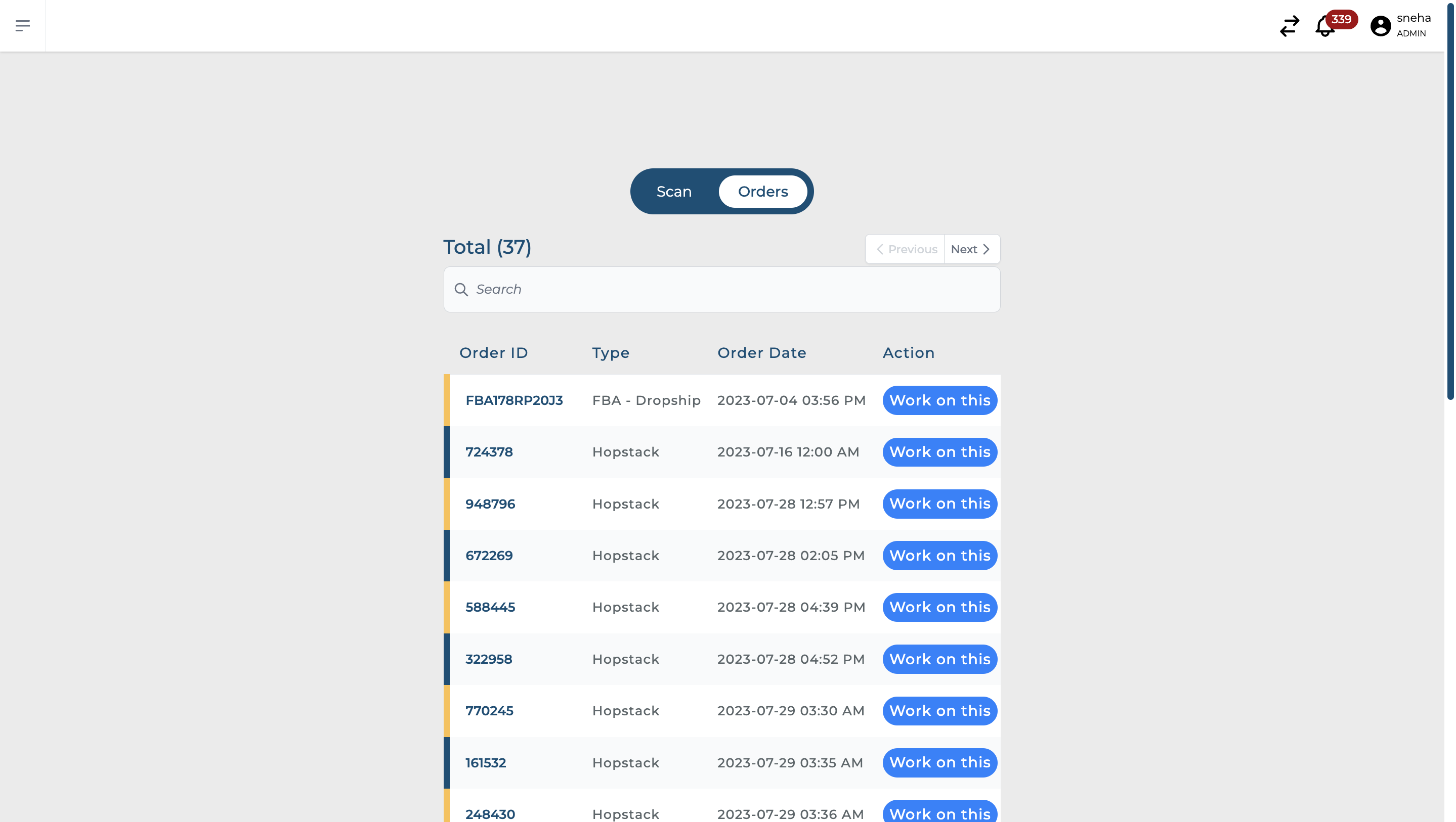 To start working on an order, simply select "Work on this". This action is equivalent to scanning the order's tote barcode.