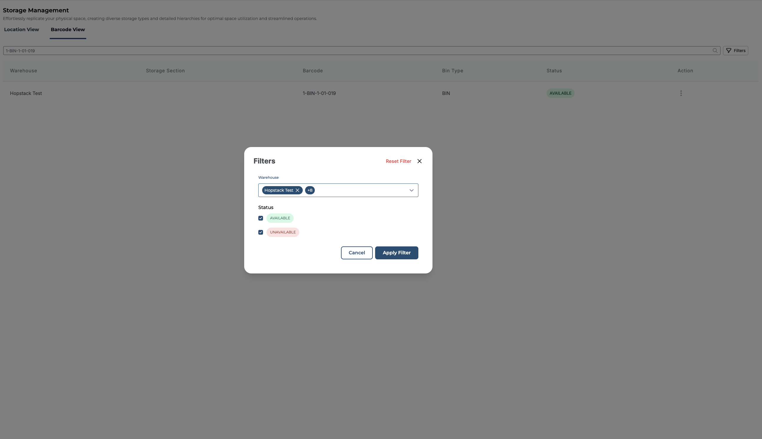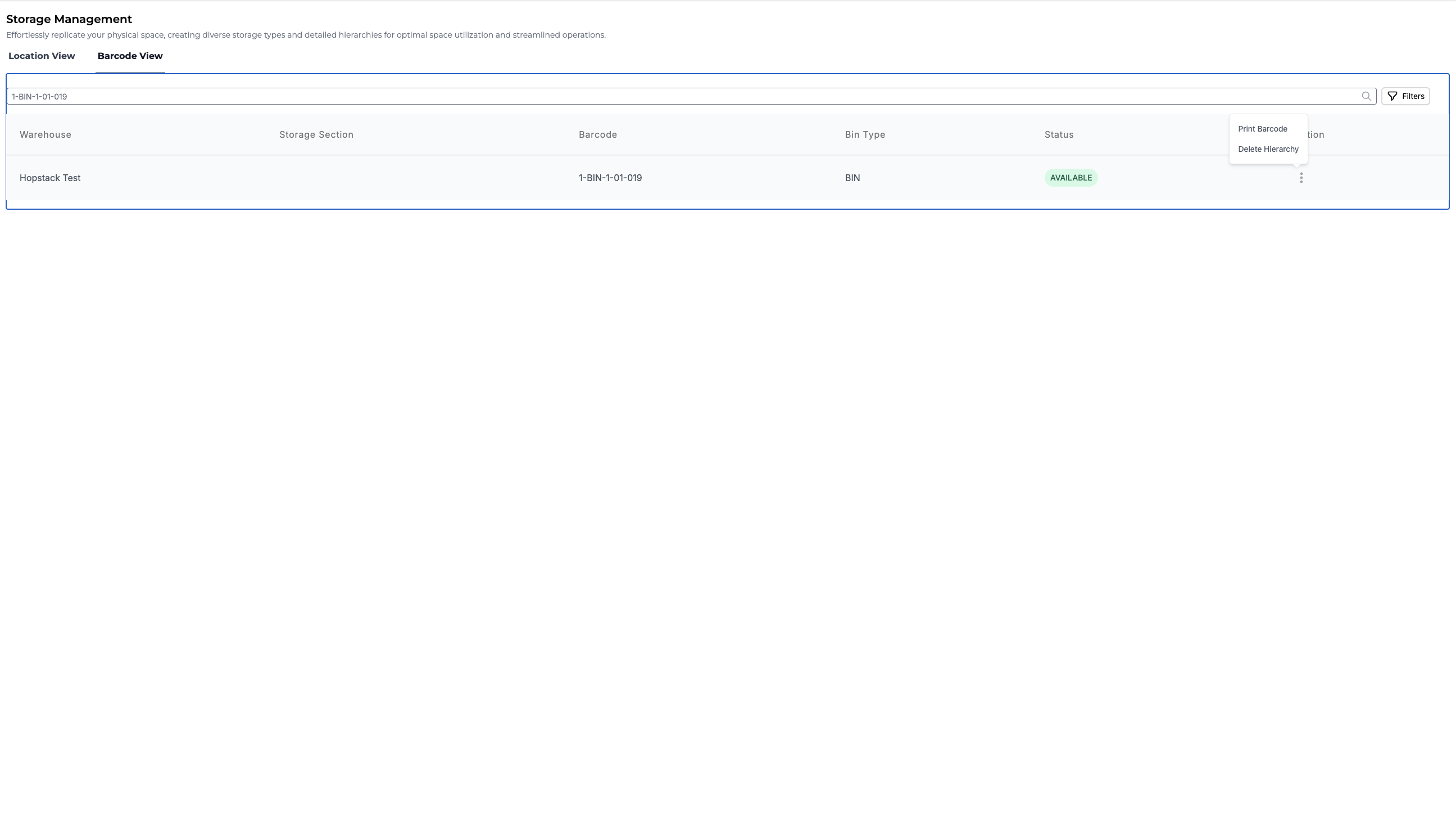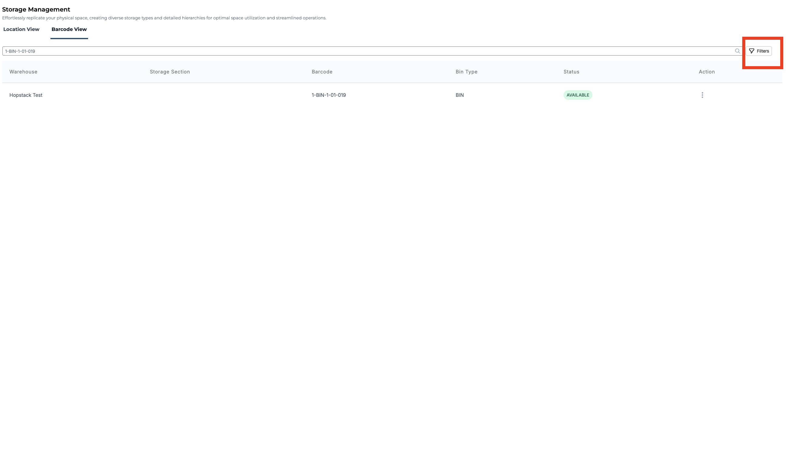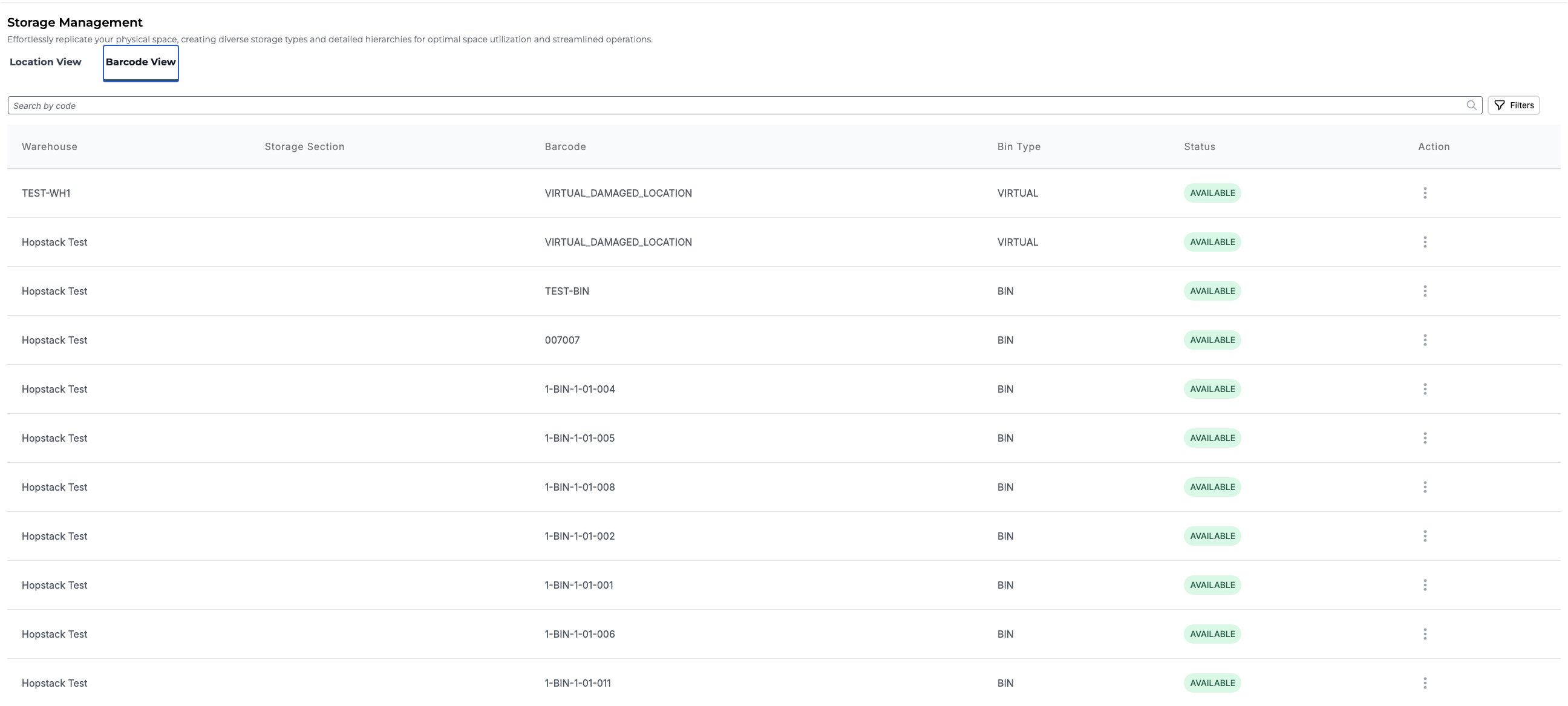 Switch to the Barcode View tab, you should be able to see all the locations within the warehouses. This might include details of the Warehouse, Barcode, Storage Section, Bin Type, and Status.