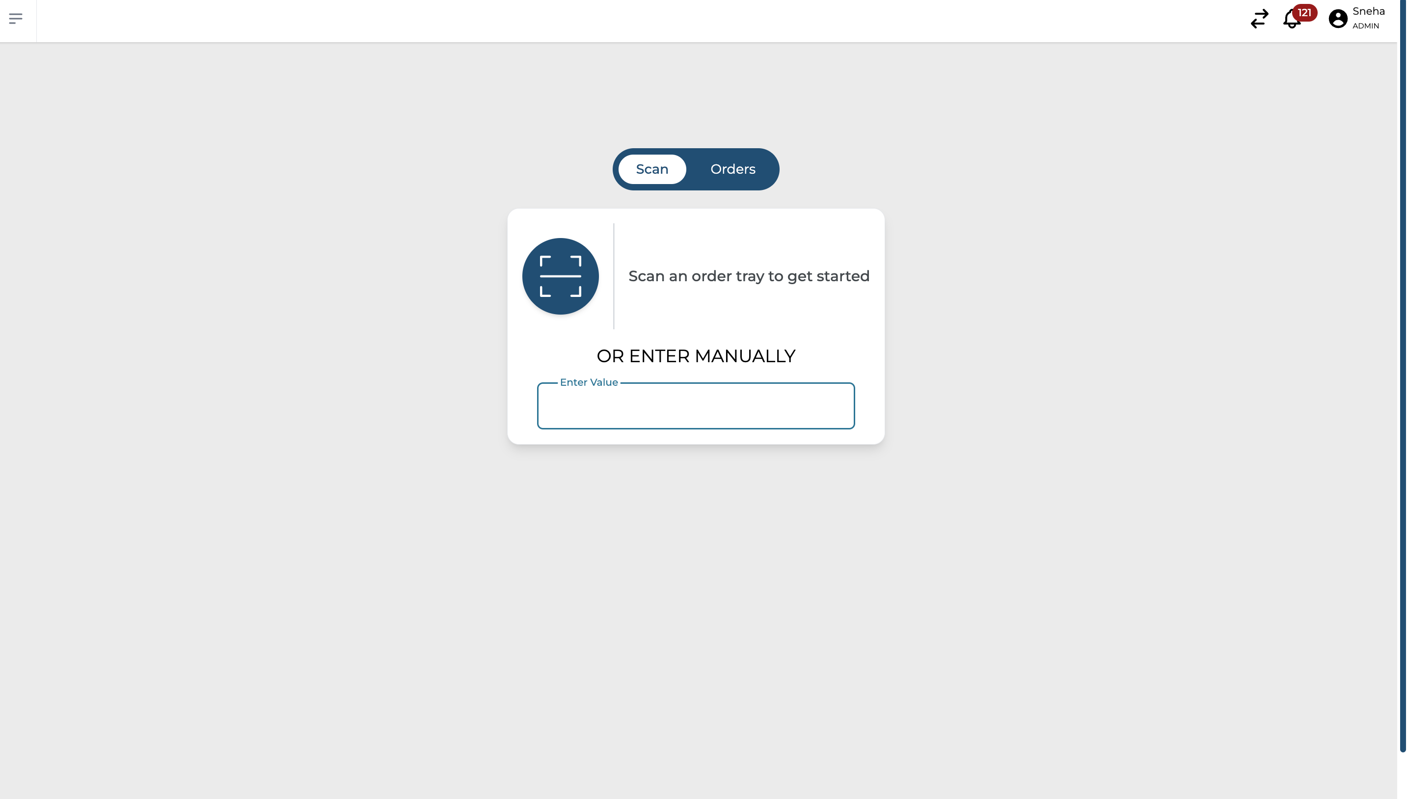 In the Scan View, you can select an order for packing by scanning an order tray barcode or manually entering the order ID.