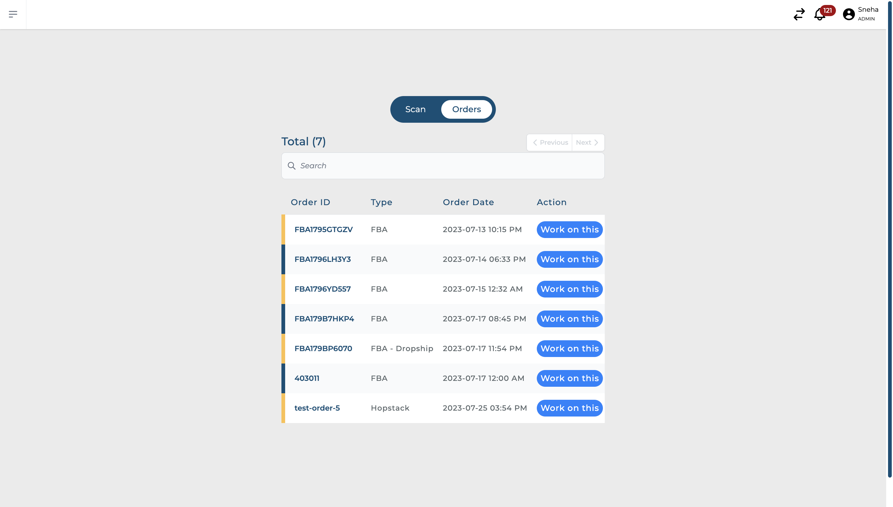 Review the order details. When you find the order you want to pack, click on the "Work on this" button in the "Action" column. This will start the packing flow for that selected order.