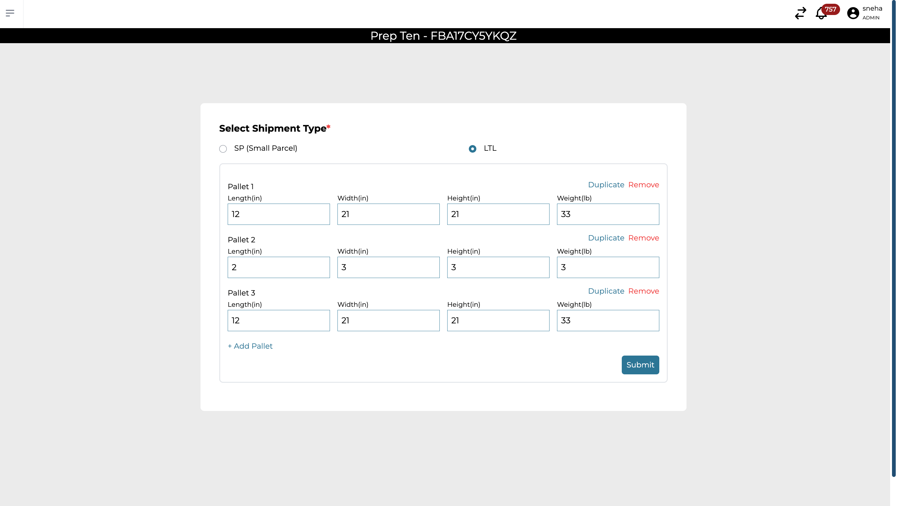 If shipping multiple pallets, utilize 'Add Pallet' for each new pallet. Options to 'Edit' or 'Remove' pallet details are available.