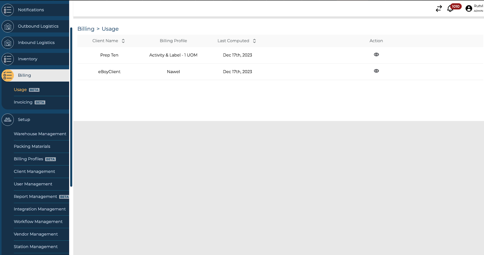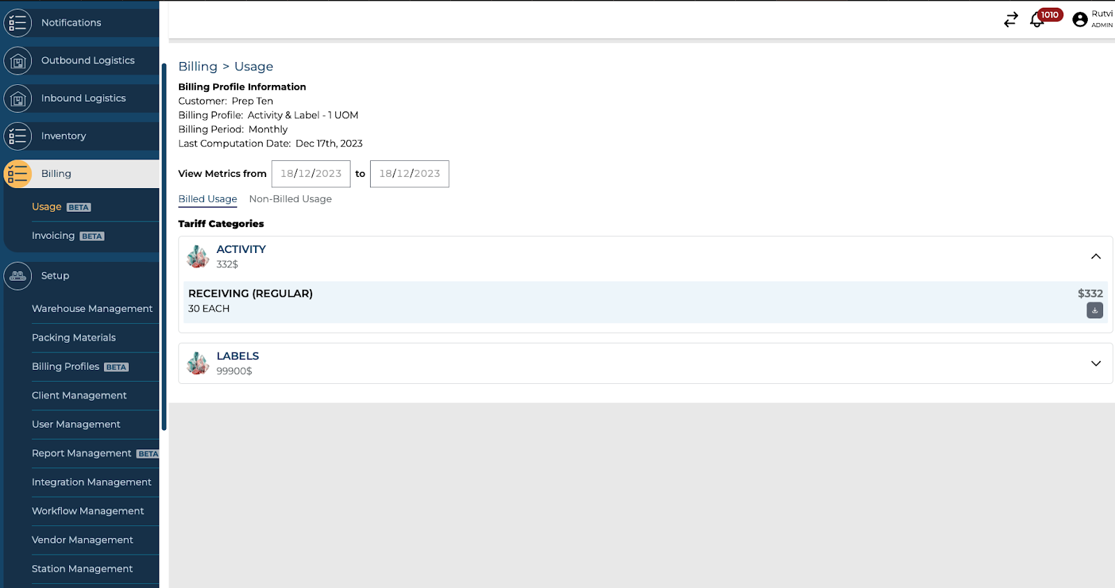On associating a Billing Profile with a Client, and warehouse operations have commenced for that specific client, you can easily access a comprehensive summary of the usage categorised by different metrics. Follow the steps below to view the Usage summary and get more comprehensive information for each sub-category: