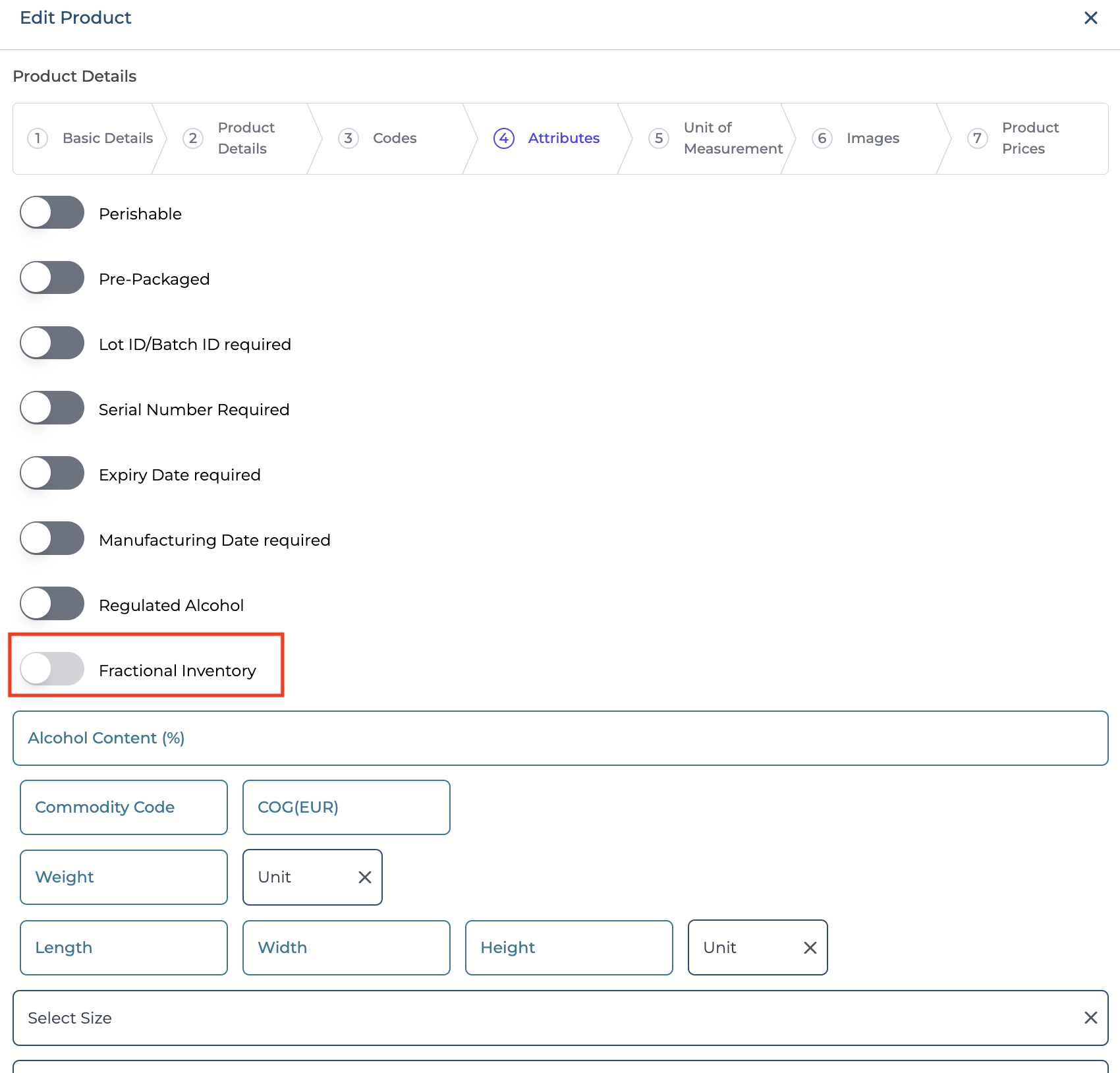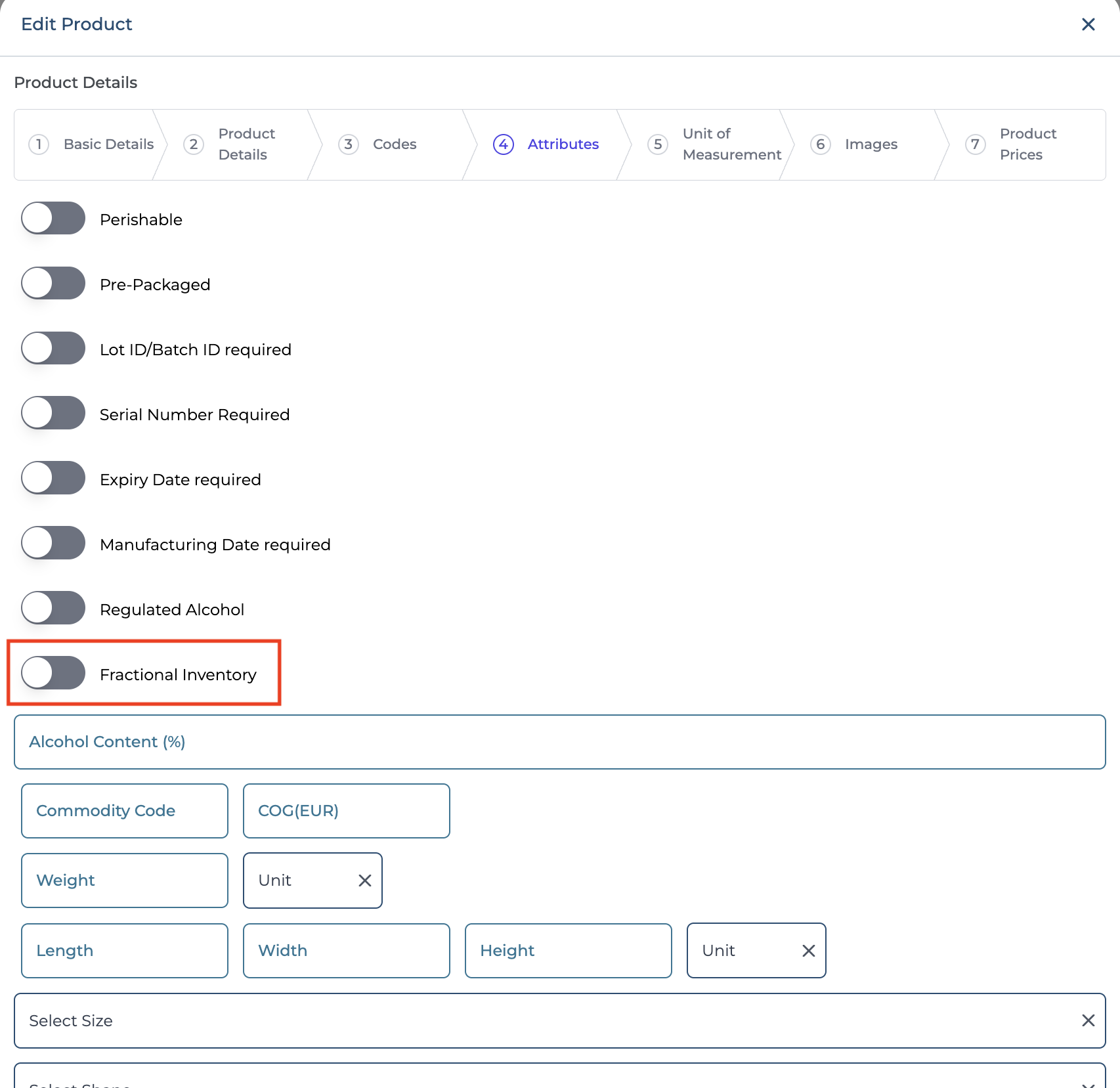 If inventory already exists for a product, the Fractional Inventory attributes cannot be activated.