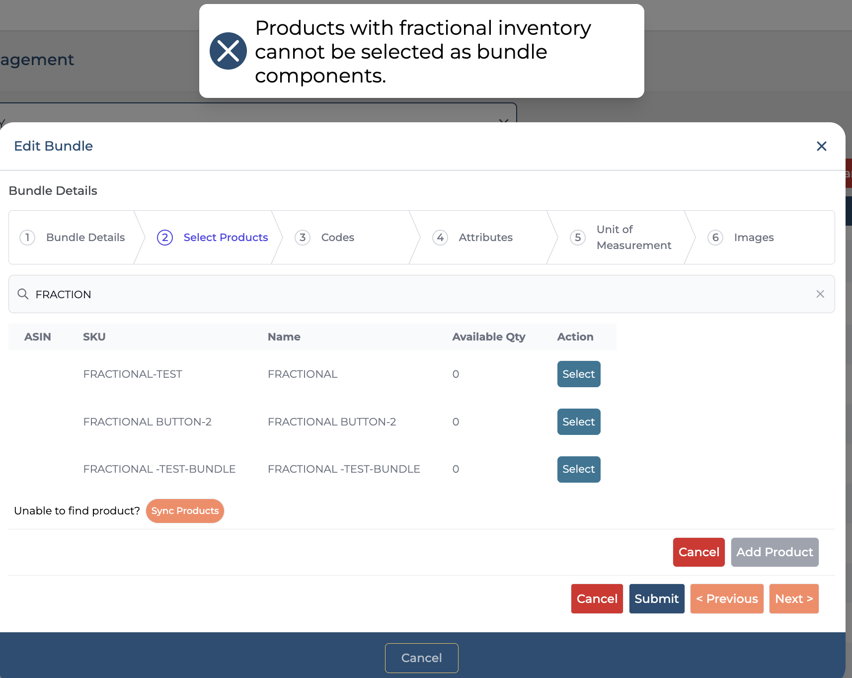 If a user attempts to create a bundle and selects a component product for which Fractional Inventory is activated, the system will display an error message.